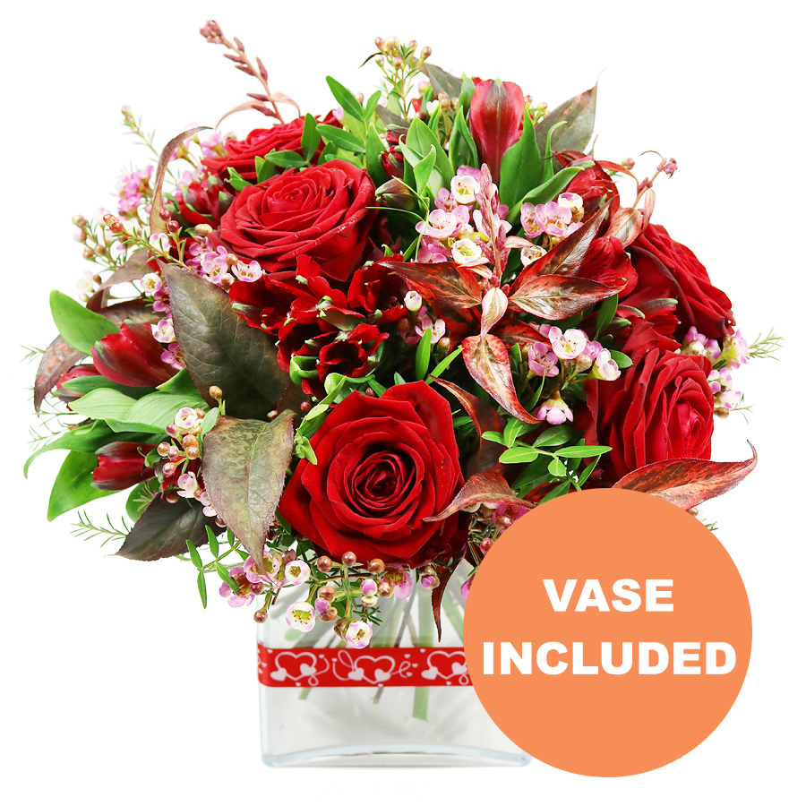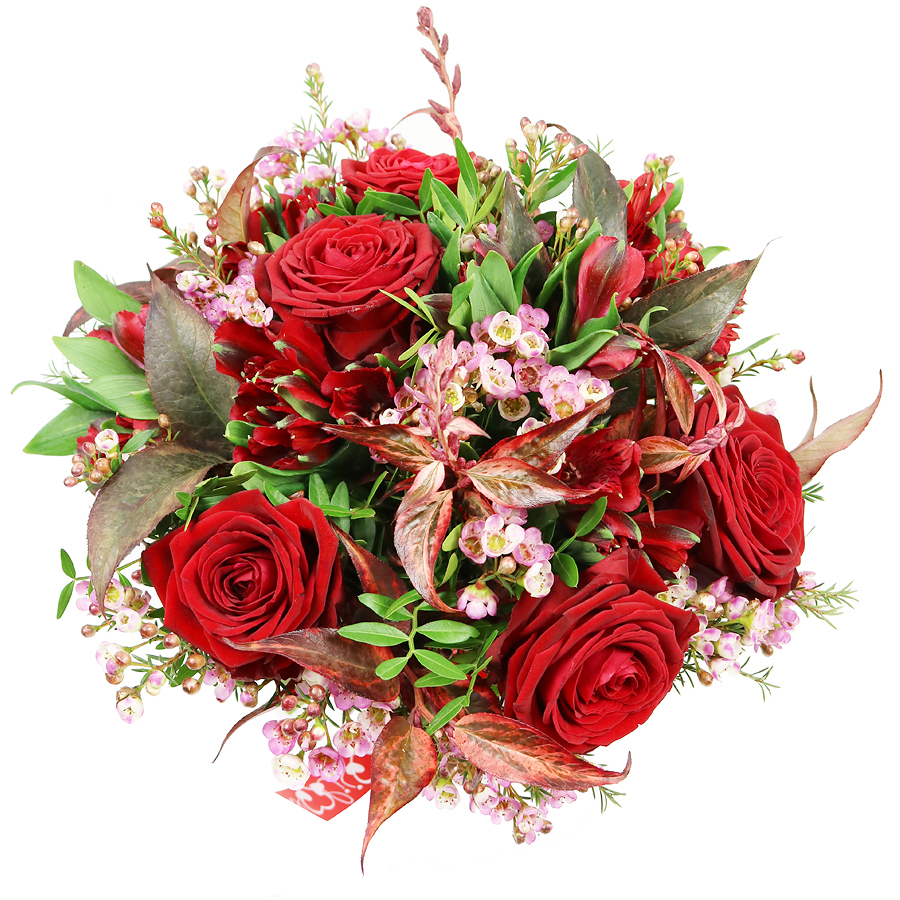 Embrace the elegant beauty and uniqueness of our red roses bouquet, featuring a harmonious mix of red roses, alstroemeria, wax flowers, pistacia, and rich red greenery. This sophisticated arrangement is perfect for expressing love and admiration.