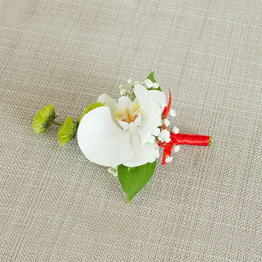 Perfect the groom's attire with our exquisite buttonhole bouquet. This beautiful arrangement features pure white orchids, lush green mini chrysanthemums, and delicate gypsophila, all elegantly wrapped with a rich red ribbon. The sophisticated design ensures the groom stands out with grace and elegance.